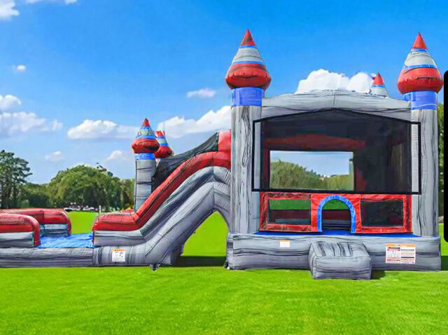 The Kings Castle features a majestic castle design, complete with vibrant colors and enchanting details that will capture the imagination of every guest. With dual lanes, it allows for friendly competition as participants race each other down the slide. Whether you're hosting a summer party with water fun or a dry event, this combo unit is adaptable to suit any occasion.